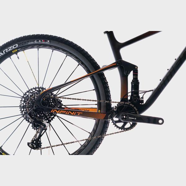 El triangulo trasero carece de rodamientos en la unión entre vainas y tirantes, aprovechando la flexión del carbono como articulación del conjunto. Esto a parte de reducir el peso consigue una rigidez excepcional y comparable con una hardtrail.